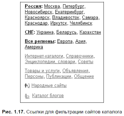 Но на этом возможности формирования списка ссылок не заканчиваются. Обратите внимание на правую колонку любой страницы каталога (рис. 1.17). С помощью блока ссылок, расположенных в ней, вы можете выполнить более узкую выборку. Во-первых, отобрать сайты по территориальной принадлежности. Наиболее точная выборка может быть выполнена по России и ее городам. Уточнение до города реализовано также по Украине и Белоруссии, по остальным государствам СНГ — выборка по государству, без уточнения города. Определение принадлежности сайта с точностью до города осуществляется и по некоторым иным государствам (Германия, США), по остальным определяется лишь государство.