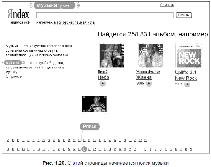 Не удивительно, что и здесь сработал закон перехода количества в качество. Когда количество запросов музыкальных произведений перешло критическую отметку, Яндекс создал специальную службу Яндекс. Музыка(рис. 1.20).
