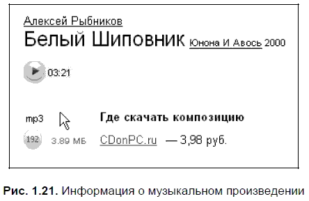 Переход по ссылке с названия исполнителя открывает страницу со списком его альбомов и композиций (рис. 1.22). Под названием каждого альбома или композиции есть кнопка для прослушивания небольшого отрывка. Щелкните на ней — откроется окно, где будет список отрывков, представленных различными партнерами. Как правило, это отрывок длительностью до 1 минуты и невысокого качества — только для пробного прослушивания произведения.