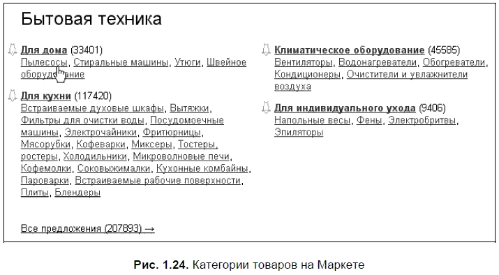 Такие фильтры, с набором условий выбора, на Яндекс. Маркете назвали рецептами. А для некоторых наиболее популярных разделов, вы можете спросить совета у Гуру (рис. 1.26). Последовательно отвечая на ряд простых вопросов, вы сможете подобрать модель, соответствующую вашим требованиям, начиная от телефона для студентов catalogmodels.xml?CAT_ID=160043&hid=91491&showlayer=rezqlayer) и заканчивая кондиционером для ценителей комфорта &showlayer=rezqlayer). Разделы, в которых можно воспользоваться рецептами, отмечены в каталоге специальным значком.