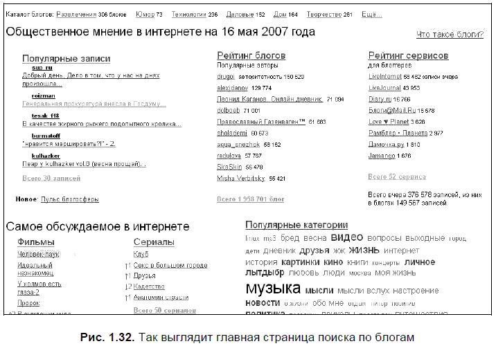 Итак, на странице поиска ( http://blogs.yandex.ru/) на первом месте, хотя и набранные мелким шрифтом, размещены ссылки на разделы специализированного каталога блогов. На момент, когда просматривался этот каталог, в него было внесено 1455 блогов, разнесенных по 8 категориям. Деловые блоги и блоги Юмор, Развлечения и Общество, Дом и Творчество(рис. 1.32). В каждом разделе выделено по три самых популярных на текущий момент блога. Если щелкнуть на ссылке с названия раздела, попадаешь на страницу, где так же, как в каталоге сайтов, размещены ссылки на блоги, включенные в этот раздел.