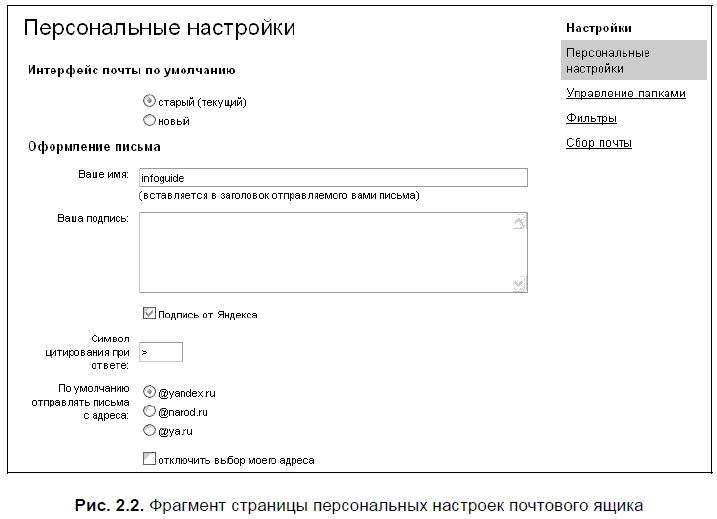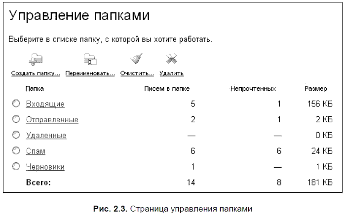 На странице управления папками (рис. 2.3) все они представлены в виде списка, в котором, кроме названия папки, имеется информация о количестве писем в каждой из них (в том числе количество непрочтенных) и размере, который эти письма занимают. Для того чтобы выполнить действие над папкой, отметьте ее и щелкните на соответствующей выбранному действию надписи.