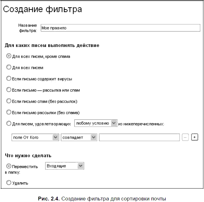 Составив условия, необходимо определить действия, которые будут выполняться над письмами, отобранными фильтром. Вы можете выбрать только одно из возможных действий:
