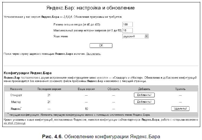 На этой странице (рис. 4.6) будет показана версия установленного у вас Яндекс. Бара, и если она устарела, то будет предложено ее обновить. Здесь же (вместо использования панели настроек самого плагина) можно выполнить некоторые настройки Яндекс. Бара — установить размер окошка ввода текста, задать максимальный размер истории запросов, выбрать язык интерфейса. Через эту же страницу можно включить поддержку поиска вводом поискового запроса в строке адреса (поиск будет выполняться через Яндекс). В том случае, если вы выбрали такой вариант формирования запросов, вы спокойно можете отключить поле ввода запроса на Яндекс. Баре.