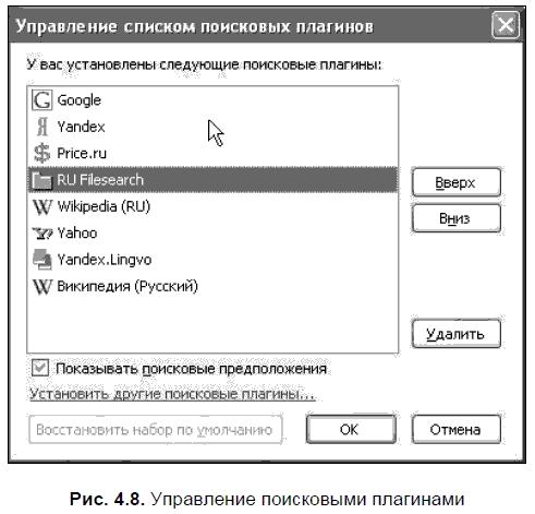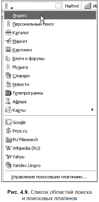 А если в поле ввода поискового запроса поставить флажок Искать на этом сайте, то область поиска ограничится только тем сайтом, который просматривается в данный момент. Такая возможность доступна в том случае, если поиск ведется на Яндексе. Если вы установили на свой компьютер поисковую систему от Яндекса ( Персональный поиск), то в список поисковых систем будет добавлена и строка Персональный поиск(рис. 4.9).