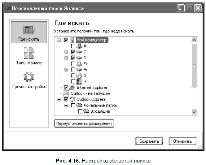 На тот случай, если вы уже после установки Персонального поиска устанавливали или переустанавливали одну из следующих программ — Firefox, Thunderbird или The Bat! для корректной работы поиска необходимо воспользоваться кнопкой Переустановить расширениявкладки Где искать. После выполнения этой операции Персональный поиск сможет выполнять индексирование данных, связанных с названными программами.