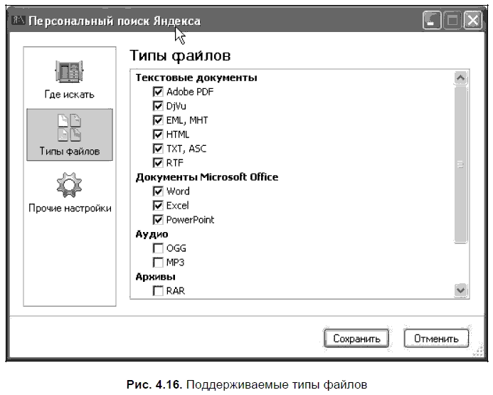 Второе дополнение связано с правой колонкой окна поиска. При работе с персональным поиском здесь присутствуют новые переключатели (табы). С их помощью можно до начала поиска определить, какие типы файлов будут включены в результаты поиска — это могут быть все файлы либо только документы, письма, музыкальные файлы, либо этот поиск будет проводиться по кешам браузеров.