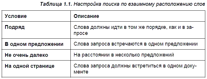 С помощью первого блока условий (табл. 1.1) назначается требование по взаимному расположению искомых слов (иначе — расстояние между словами).