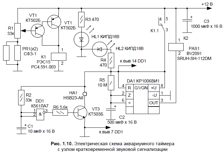 Особенности устройства — в полуавтоматическом режиме работы. При наступлении рассвета (включении освещения в комнате, где установлены фотодатчики) электронное устройство издает кратковременный звуковой сигнал и включает слаботочное электромагнитное реле К2. Исполнительные контакты реле К2, в свою очередь, включают лампу аквариумного освещения вместе с компрессором-помпой (на схеме не показаны). Лампа освещения и компрессор остаются включенными в течение почти 4 ч (зависит от номиналов элементов R5C2). По окончании выдержки времени лампа освещения и компрессор отключаются. При новом рассвете (новом включении света в комнате после периода затемнения) цикл работы устройства повторяется — так происходит ежедневно.