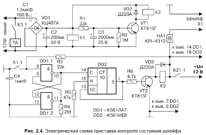 Чтобы собрать устройство, лишенное перечисленных ранее недостатков, с тем, чтобы его можно было эксплуатировать в любое время с возможностью постоянного подключения к телефонной линии, не опасаясь ложных срабатываний, рекомендую альтернативную схему приставки, представленную на рис. 2.4.