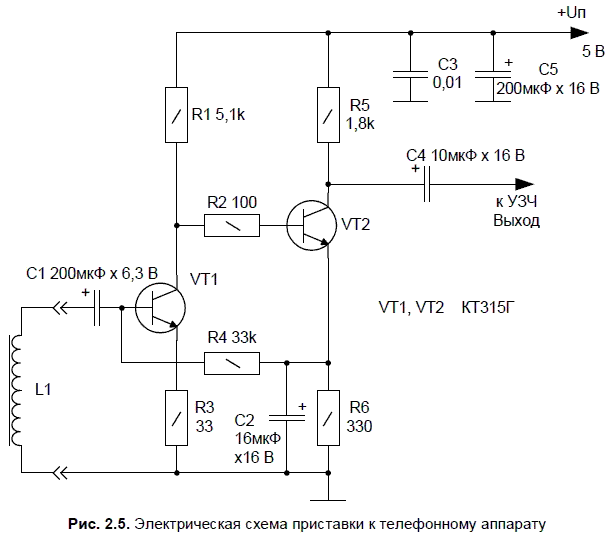 Приставка подключается к телефонной линии с помощью катушки L1, надеваемой на телефонный шнур. Катушка L1 — это датчик магнитной индукции, с помощью которого происходит сканирование состояния телефонной линии. Слабые импульсы с катушки L1 поступают на усилитель слабых сигналов, собранный на транзисторах VT1, VT2 с большим коэффициентом усиления по току h21e. Транзисторная схема представляет собой классический двухкаскадный усилитель звуковой частоты с отрицательной обратной связью.