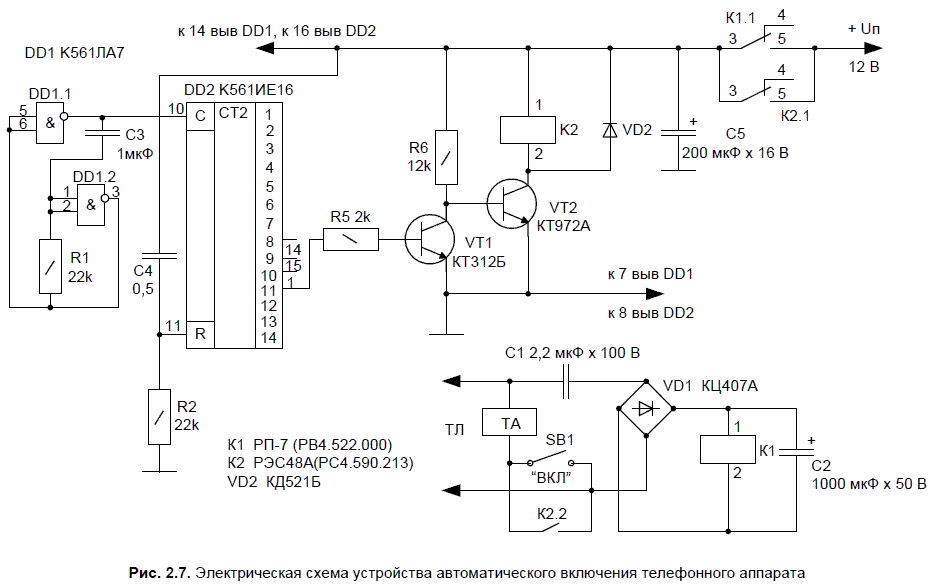 По функциональным особенностям микросхемы-счетчика К561ИЕ16 сигнал высокого уровня поочередно появляется на ее выходах. До того, как высокий уровень появится на выводе 11 DD2, там будет присутствовать низкий уровень. При этом транзистор VT1 находится в закрытом состоянии, соответственно транзистор VT2 — открыт, реле К2 включено и телефонный аппарат (ТА) подключен к телефонной линии (ТЛ).