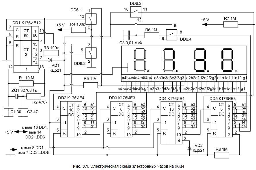 Так как у микросхемы DD1 нет сравнительно низкочастотного выхода, пришлось задействовать тактовые выходы T1…T4. На элементах R3 и VD1 собран простейший сумматор, благодаря которому в точке соединения этих элементов — правильный меандр частотой 256 Гц. Он используется для работы ЖКИ.