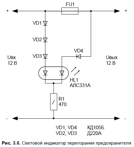 Пока предохранитель FU1 исправен, к обоим анодам светодиода HL1 приложено напряжение. Порог свечения корректируется сопротивлением резистора R1. Если предохранитель обрывает цепь питания нагрузки, то зеленый светодиод гаснет, а красный остается светить (если напряжения питания совсем не пропало). Поскольку допустимое обратное напряжение для светодиодов мало и ограничено, то для указанной конструкции в схему введены диоды с разными электрическими характеристиками VD1—VD4. То, что к зеленому светодиоду последовательно включен только один диод, а к красному три, объясняется особенностями светодиода АЛС331А, замеченными на практике. При экспериментах оказалось, что порог напряжения включения красного светодиода меньше, чем у зеленого. Чтобы уравновесить эту разницу (заметную только на практике), количество диодов неодинаково.