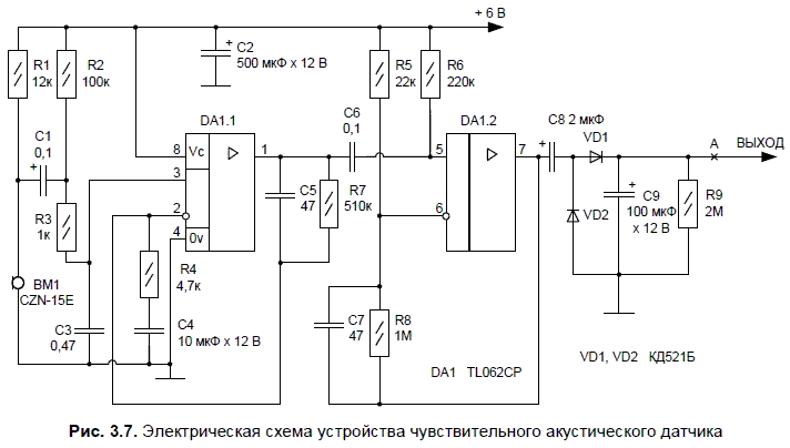 Усиленный сигнал переменного напряжения с выхода ОУ DA1.1 через разделительный конденсатор C8 поступает на выпрямитель, реализованный на диодах VD1 и VD2. Выпрямленное напряжение сглаживается оксидным конденсатором С9 и шунтируется резистором R9. Цепь С9R9 одновременно является узлом задержки. Когда в точке А (на выходе схемы) появится высокий уровень напряжения (амплитудой 3,6…3,8 В), заряжающий конденсатор С9, этот уровень будет присутствовать в точке А не менее чем 4 мин. Высокий уровень в точке А является управляющим по отношению к исполнительному узлу (на схеме не показан), соответственно управляющему любой электронной нагрузкой, например, лампой накаливания в сети 220 В, установленной на лестничной клетке. В этом случае устройство будет полезно, как автомат-включатель освещения при приближении жильцов к микрофону ВМ1. Когда вблизи электретного микрофона наступит тишина, по истечении выдержки 4 мин, лампа освещения автоматически погаснет до следующего акустического воздействия на микрофон. Если шум вокруг ВМ1 сохранится во время отсчета времени после первоначального звукового воздействия, то выдержка времени соответственно увеличится и лампа освещения будет гореть до тех пор, пока шум не прекратится плюс еще 4 мин.