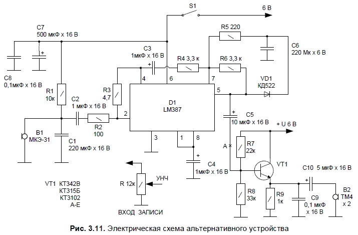При необходимости к выходу микрофонного усилителя можно подключать звукозаписывающий аппарат (магнитофон) и более мощный усилитель. Место подключения — точка А.
