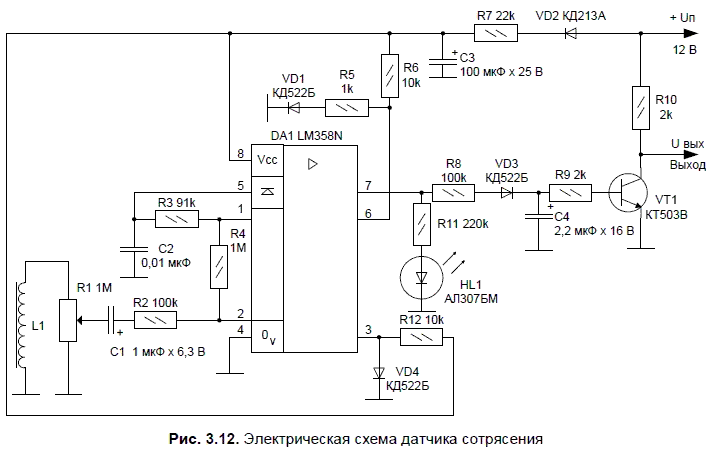Среди многочисленных датчиков состояния встречаются всевозможные приборы, поражающие подчас своими конструктивными особенностями. Однако при разработке датчиков учитываются, как правило, более прозаические параметры, такие как компактность, высокая чувствительность, надежность (большое время наработки до отказа), минимальное наличие механических частей, универсальность в применении, работа в широком диапазоне температур и напряжения питания, отсутствие помех для других узлов устройства, минимальное потребление тока и др. Еще одна электрическая схема из серии датчиков воздействия — устройство датчика сотрясения — представлена на рис. 3.12.
