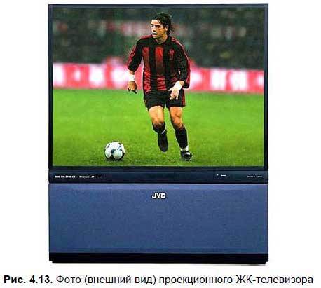 DLP-проекционный телевизор (DLP — Digital Light Processing — «цифровая обработка света», разработка фирмы Texas Instruments) повторяет традиции ЖК-проекционных телевизионных приемников, но отличается более высокой контрастностью и яркостью картинки, т. к., в отличие от ЖК-телевизора, свет от лампы в нем не проходит сквозь жидкие кристаллы, а отражается от микрозеркал специально разработанного под эту технологию DMD-чипа. Предельный размер экранов проекционных телевизоров составляет около 60 дюймов. Пример такого телевизора представлен на рис. 4.13.