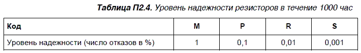 Шестой элемент — буквенный код, которым обозначается уровень надежности резисторов в течение 1000 час. Для пояснения этого параметра обратите внимание на табл. П2.4.