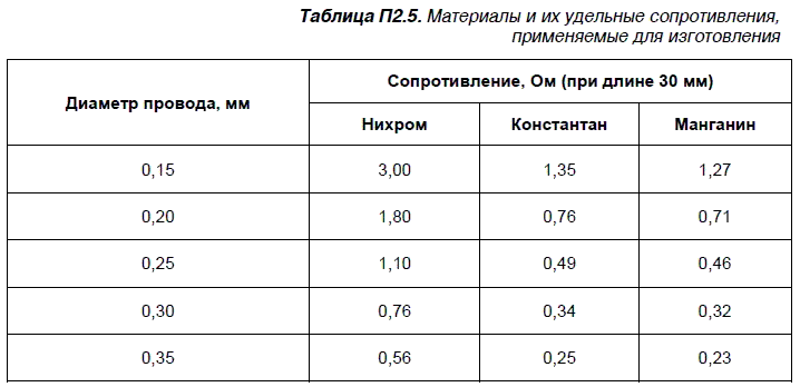 Используя справочные данные, приведенные в табл. П2.5, можно самостоятельно изготовить проволочный резистор из соответствующего материала.