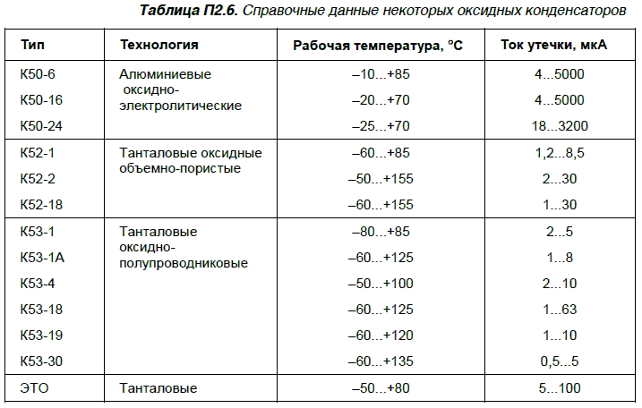 В табл. П2.6 сведены данные о некоторых популярных оксидных конденсаторах, изучив которые можно определить те или иные прерогативы в использовании данных конденсаторов. Наименьшие токи утечки среди оксидных конденсаторов имеют К53-1А, К53-18, К53-16, К52-18, К53-4.