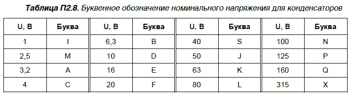 Конденсаторы, как и постоянные резисторы, разделяются по группам допуска отклонения от номинальной емкости. Эти данные сведены в табл. П2.7. В табл. П2.8 представлены данные буквенного обозначения напряжения (маркировки) на конденсаторах.