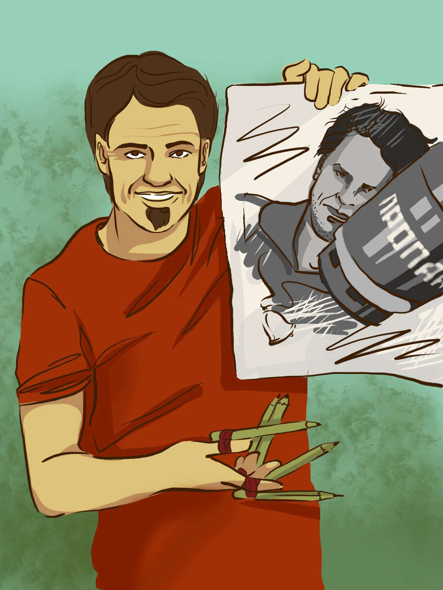 Это был действительно «смертельный номер». Скрипка, открыв рот, смотрел, как мельчайшие движения пальцев с привязанными к ним карандашами превращают белую поверхность в испещренный пятнами фон. Краснов рисовал не последовательно, как делают художники — овал превращается в схематичное лицо, лицо постепенно обрастает подробностями — он, скорее, передавал стоящую перед его внутренним взглядом фотографию. Судорожные подергивания пяти карандашей сразу с какой-то нечеловеческой точностью воспроизводили картинку целиком.