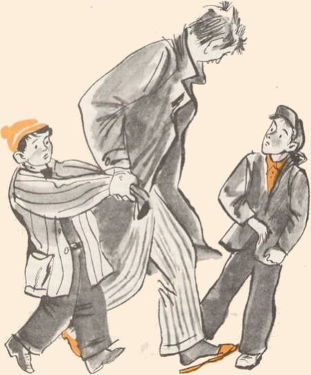 Я уже подходил к своему дому, как вдруг увидел странную картину: навстречу мне шёл тощий свирепого вида дядька в коричневом плаще «болонья» и в войлочных домашних шлёпанцах. Дядька держал за руку Мишку, на котором был какой-то задрипанный стёганый ватник с пятнами краски. Ватник был очень большой и доходил ему чуть ли не до колен. Дядька шёл быстро и целеустремлённо, а Мишка отставал и шагал безо всякого энтузиазма, шаркая башмаками по асфальту. Получалось, что дядька вроде как даже тащил Мишку. Я сразу догадался, что случилось что-то недоброе и что Мишку куда-то ведут. Надо было немедленно его выручать. Но как? Я решил огорошить дядьку каким-нибудь неожиданным вопросом, чтобы Мишка смог выскользнуть из его клешни.
