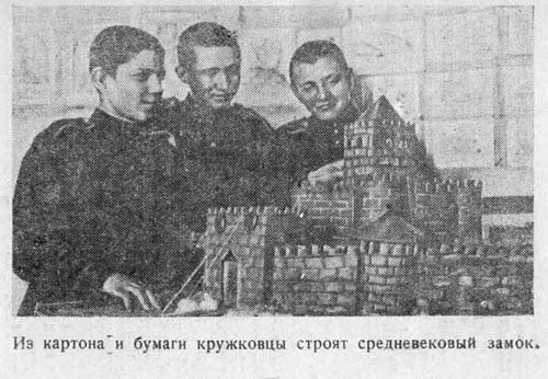 Вот кабинет истории; из картона и прессованной бумаги кружковцы строят средневековый замок и крепостной вал. В другой комнате занимается литературный кружок; юные поэты, волнуясь, читают стихи. Через плотно прикрытую дверь доносятся плавные звуки вальса «На сопках Манчжурии» — это репетиция кружка народных инструментов. А вот, склонившись над досками, обдумывают очередной ход заядлые шахматисты. Найдется время и для письма родным, и для чтения увлекательной повести, и для того, чтобы подобрать слова для очередного кроссворда.