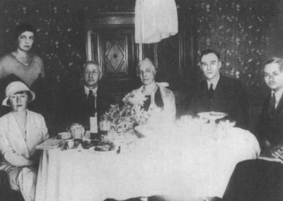 Слева направо: с и дят княгиня А. Кугушева, И. А. Бунин, В. Н. Бунина, Л. Ф. Зуров, князь А. Кугушев, не виден шведский журналист; стоит Г. Н. Кузнецова. Париж, 10 ноября 1933 г.
