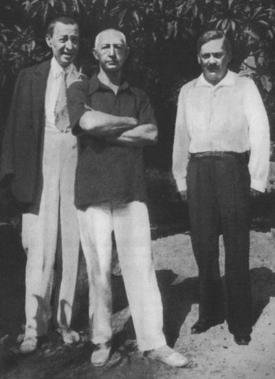 Слева направо: С. В. Рахманинов, И. А. Бунин, М. А. Алданов. Жуан-ле-Пэн,5 августа 1930 г.