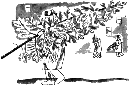 Утром мы вместе вышли: я — в школу, а дед — по елочным пунктам. И домой возвратились вместе. Идем мы с Буном из школы, а впереди громадная елка по тротуару едет. Густущая, зеленая, с такими лапами, что и человека под ней не видно, будто сама движется. Я деда только по валенкам и узнал. Налетели мы с Буном, подхватили елку и втроем домой приволокли.