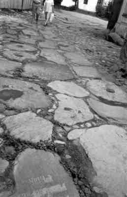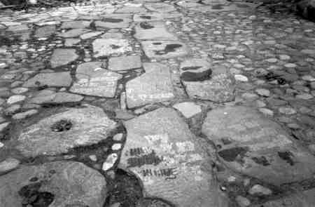 Если последовать версии историков дальше, то получается еще нелепее. Якобы лишь потом, через сто или даже через двести-триста лет, монахи монастыря неожиданно «наконец-то вспомнили» о нижайшей просьбе давно умерших людей XV-XVI веков «захоронить их на дороге». Пусть так. Но тогда, надо полагать, повинившись в такой долгой отсрочке, пришли бы на кладбище, аккуратно выкопали гробы и саркофаги, перенесли их на дорогу и там вновь захоронили бы, заново накрыв плитами. Исполнив, тем самым, «волю усопших». Пусть с запозданием на сто-триста лет, но все-таки исполнили бы. Но ведь сделали совсем другое! Старое кладбище попросту грубо разгромили, останки выбросили (неужели кто-то осмелится здесь сказать, что монахи, дескать, «сами об этом просили»). Этот погром экскурсоводы не скрывают, сообщают прямым текстом и абсолютно недвусмысленно. Так что старых захоронений – гробов с останками монахов XV-XVI веков – сегодня не осталось здесь ни одного. А вот плиты с них сняли, вымостили ими дорогу и затем сбили многие надписи. Причем, вперемешку с плитами уложили мельничные жернова! См. рис.12.46, рис.12.47. Кстати, а чью «волю» исполняли в данном случае? Какое отношение имеют мельничные жернова к гипотетическому желанию монахов лежать после смерти под ногами прохожих? И уж, повторим, совсем странным (в рамках предлагаемой нам романовской версии) представляется явно намеренное сбивание надписей с плит. Несколько типичных примеров показано на рис.12.48, рис.12.49, рис.12.50, рис.12.51. Не выдержав, мы спросили у экскурсовода: ну хорошо, допустим романовские историки, а вслед за ними и вы – правы. Но зачем же надписи сбивали? Вроде бы, напротив, все проходящие должны были бы видеть, что они попирают ногами плиту такого-то или такого-то монаха. Например, Петра, Симеона и т.д. И в памяти потомков смирение Петра, Павла и других, послужило бы уроком и назиданием. Надо полагать, подобный вопрос задавался экскурсоводам не впервые. Их ответ был мгновенным и четким, но уже заметно раздраженным. Мол, надписи были сбиты потому, что так идея «уникального русского смирения» воплощалась бы куда лучше, чем с целыми надписями. Проходящим людям будто бы вовсе не нужно было знать даже имен тех, кого они здесь топчут. Таков был, тут же начал демагогически уверять нас экскурсовод, «старинный русский обычай».