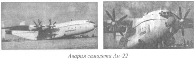 "В период эксплуатации в в/ч 21322 самолет Ан-22 № 05–09, в январе 1989 г., при прекращенном взлете в а/п Аден, потерпел поломку, в результате которой повреждена нижняя часть фюзеляжа, сдеформирован с отдельными разрушениями шп. 14, разрушены каркас левого обтекателя шасси. По неофициальным сведениям, прерванный взлет произошел из-за самопроизвольной уборки передней опоры шасси с последующим снятием с замков выпущенного положения первого и второго ряда основных опор шасси".