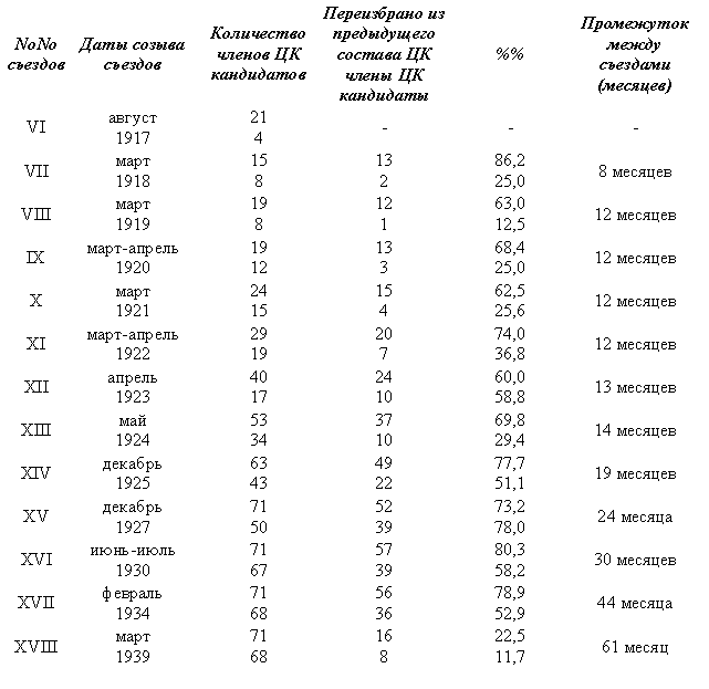 Но подлинным водоразделом является, конечно, промежуток между ХVII и ХVIII съездами партии. До ХVIII съезда, созванного в 1939 году, в составе ЦК сохранялась преемственность: в новый ЦК входило от 63,0 до 87,0 % членов предыдущего ЦК. На ХVIII съезде в ЦК, состоявшем, как и предыдущий, из 71 члена и 68 кандидатов, вошло из старого состава только 16 членов (22 %) и 8 кандидатов (11,7 %).