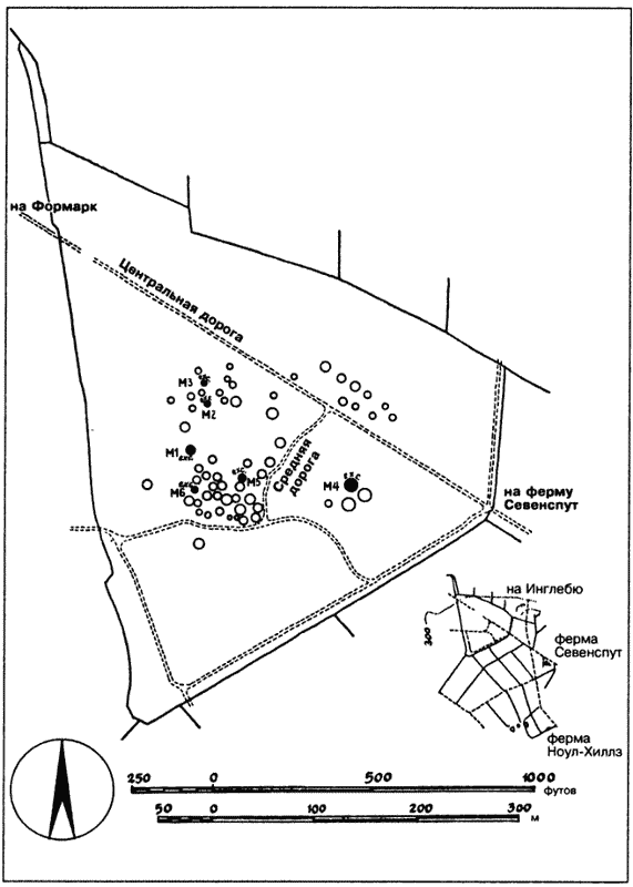 Рис. 10. План кладбища В Цнглби (Инглебю), Дербишир. Темные кружки обозначают погребения, раскопанные до 1954 года. Еще девять были раскопаны позднее