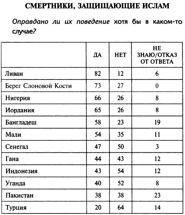 Это ужасающие цифры. Даже если бы весь мусульманский мир ответил так же, как мусульмане Турции (где 4 % считают, что поведение смертников оправдано «часто», 9 % — «иногда», а 7 % — «лишь в редких случаях»), у нас и здесь был бы повод для беспокойства: это бы значило, что около 200 миллионов людей в мире открыто поддерживает терроризм. Однако Турция — это просто исключительно мирная страна по сравнению с другими частями мусульманского мира.