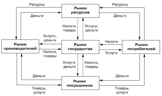 Маркетинг преимущественно имеет дело с денежными транзакциями– коммерческим обменом ценностями между двумя сторонами. Однако существует обмен и без участия денег – бартер, при котором происходит обмен ценностями (например, товарами). Любая экономика представляет собой совокупность рынков, объединенных обменными процессами (рис. 3).