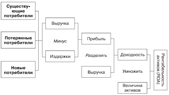 Такие значимые задачи маркетинга, как завоевание и удержание клиентов, напрямую связаны с созданием ценности для владельцев бизнеса и акционеров – формированием чистого денежного потока. Эта связь показана на так называемой схеме Du Pont(рис. 9).