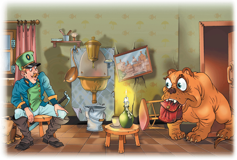 Раз как-то, вечером, сидел солдат в своей каморке; совсем уже стемнело, а у него не было денег даже на свечку; он и вспомнил про маленький огарочек в огниве, которое взял в подземелье, куда спускала его ведьма. Солдат достал огниво и огарок, но стоило ему ударить по кремню, как дверь распахнулась и перед ним очутилась собака с глазами, точно чайные чашки, та самая, которую он видел в подземелье.