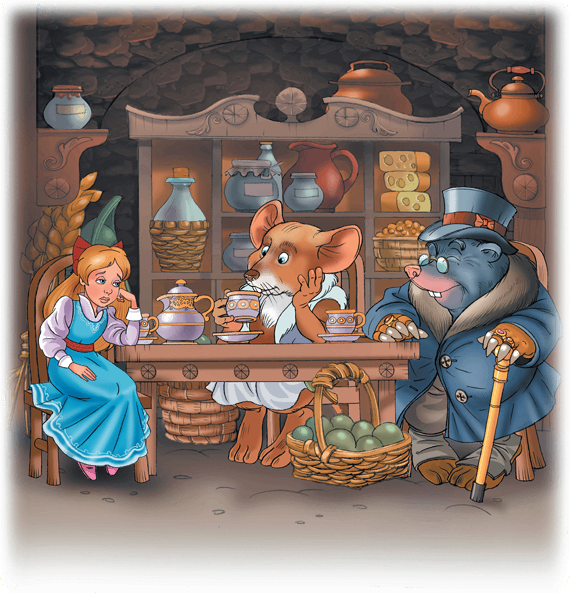 — К нам скоро придет гость, — сказала полевая мышь. — Мой сосед обычно навещает меня раз в неделю. Он живет куда лучше меня: у него огромные залы, а ходит он в чудесной бархатной шубке. Вот если бы тебе удалось выйти за него замуж! Ты бы зажила на славу! Беда только, что он слеп и не может видеть тебя; но ты расскажи ему самые лучшие сказки, какие только знаешь.
