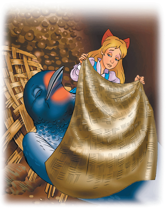 Девочка вся задрожала от испуга — птица ведь была в сравнении с крошкой просто великаном, — но все-таки собралась с духом, еще больше закутала ласточку, потом сбегала принесла листок мяты, которым укрывалась вместо одеяла сама, и покрыла им голову птички.
