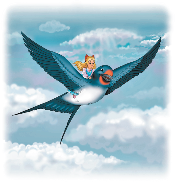 — Да, да, я полечу с тобой! — сказала Дюймовочка, села птичке на спину, уперлась ножками в ее распростертые крылья и крепко привязала себя поясом к самому большому перу.