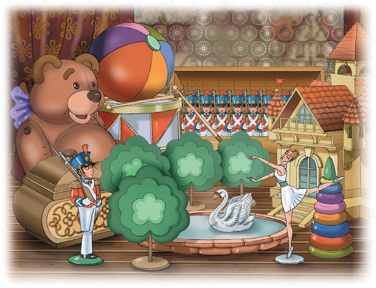 Поздно вечером всех других оловянных солдатиков уложили в коробку, и все люди в доме легли спать. Теперь игрушки сами стали играть в гости, в войну и в бал. Оловянные солдатики принялись стучать в стенки коробки — они тоже хотели играть, да не могли приподнять крышки. Щелкунчик кувыркался, грифель плясал по доске; поднялся такой шум и гам, что проснулась канарейка и тоже заговорила, да еще стихами! Не тронулись с места только танцовщица и оловянный солдатик: она по-прежнему держалась на вытянутом носке, простирая руки вперед, он бодро стоял под ружьем и не сводил с нее глаз.