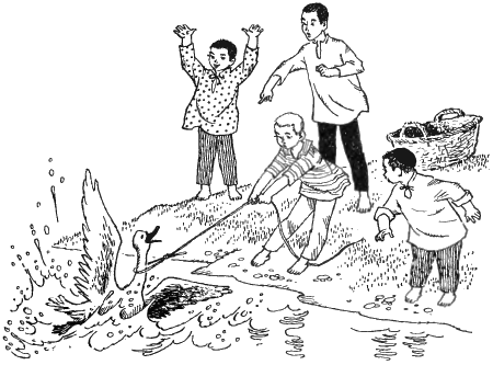 Как сказал, так и сделал — поймал петлей и потащил к берегу. Гусь, отбиваясь, чуть не свернул себе шею. Одолели всё же ребята, накрыли гусака корзинкой.