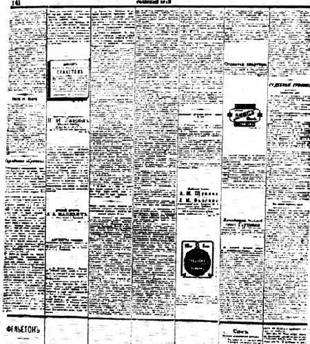 Полоса газеты «Северный край» № 141 за 1905 г., изуродованная царской цензурой. На месте фельетона Менжинского оставлено только слово «фельетон».