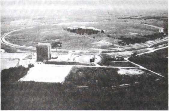 Национальная ускорительная лаборатория им. Ферми («Фермилаб») с высоты птичьего полета. Видны основное кольцо и административное здание лаборатории.