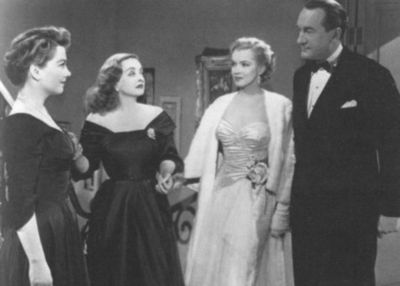 Кадр из фильма «Всё о Еве». Слева направо: Энн Бакстер, Бетт Дэвис, Мэрилин Монро, Джордж Сандерс. 1950 г.