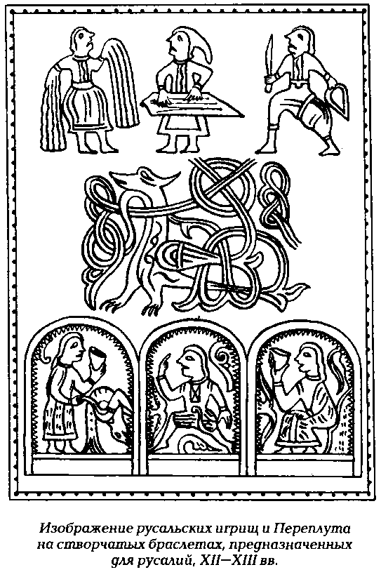 Уже в трипольской росписи встречаются псы, прыгающие и кувыркающиеся (как бы летающие) вокруг молодых растений. Культ Семаргла-Переплута тесно связан с русалиями, празднествами в честь русалок-вил. На браслете из Тверского клада изображен кумир Семаргла-Переплута: крылатый пес, как бы вырезанный из дерева, растущего в земле (показаны его корни) и сильно изогнутого (как изгибается огонь и водяные струи).