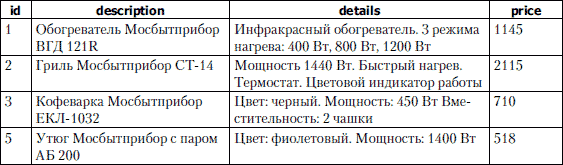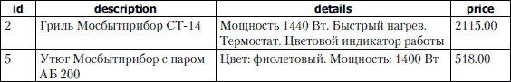 AGAINST (\'-Чайник +Мосбытприбор\' IN BOOLEAN MODE);возвращает строки, содержащие слово «Мосбытприбор», но не имеющие слова «Чайник» (табл. 3.20). Таблица 3.20. Результат выполнения запроса